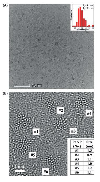 | Figure 1: A) Predicted mass activities plotted versus nanoparticle diameters. Optimal nanoparticles (blue triangles) are identified at diameters of 1.1 nm, 2.07 nm, and 2.87 nm. B) Low-index surfaces (111) (blue) and (100) (red) depicted on the 2.87 and 3 nm nanoparticle. | Figure 2: A) Overview HR-TEM image of Pt nanoparticles and size distribution histogram (inset). B) Detailed HR-TEM image shows the magnified image of six single Pt nanoparticles and the table shows their size. |